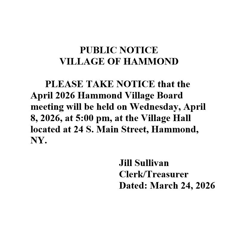 The Village of Hammond has scheduled a public hearing for the 2025/2026 tentative budget and a tax cap override hearing for Thursday, April 24 at 5pm, in the Village Office located on 24 S. Main Street, Hammond.