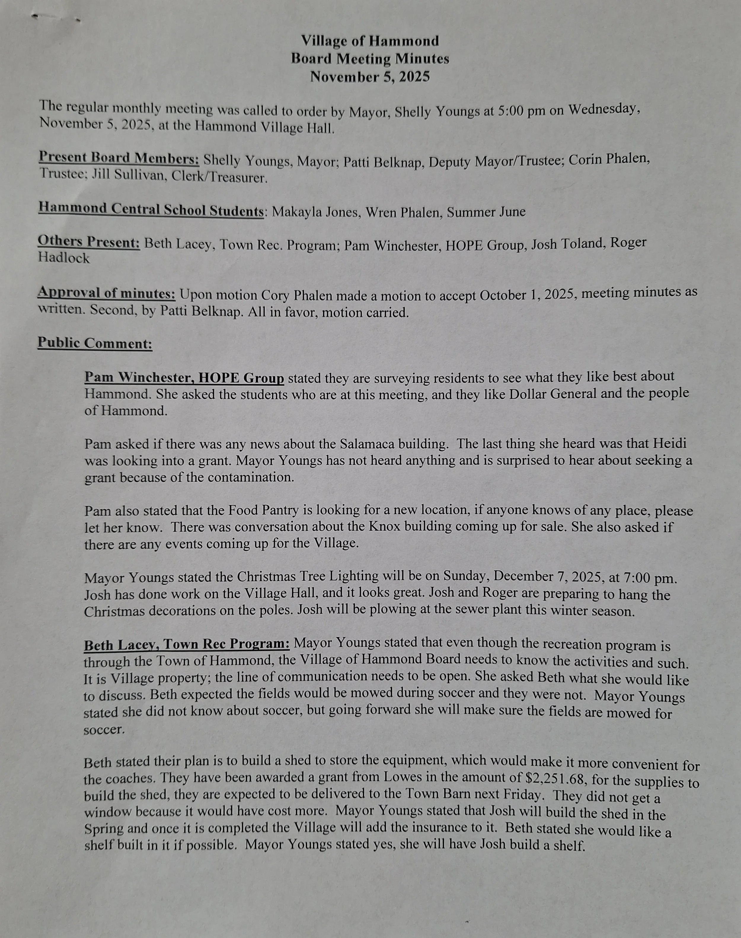 A unique village nestled in the heart of the St. Lawrence Valley. Come join us at our meetings on the 1st Wed. of each month at 5 PM . Contact Jill Sullivan for a copy of village meeting minutes at villageofhammond@gmail.com.